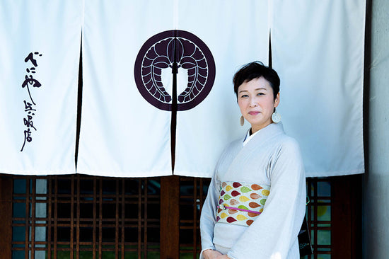明治創業のべにや呉服店に生まれ、幼少期から着物に囲まれて過ごす。