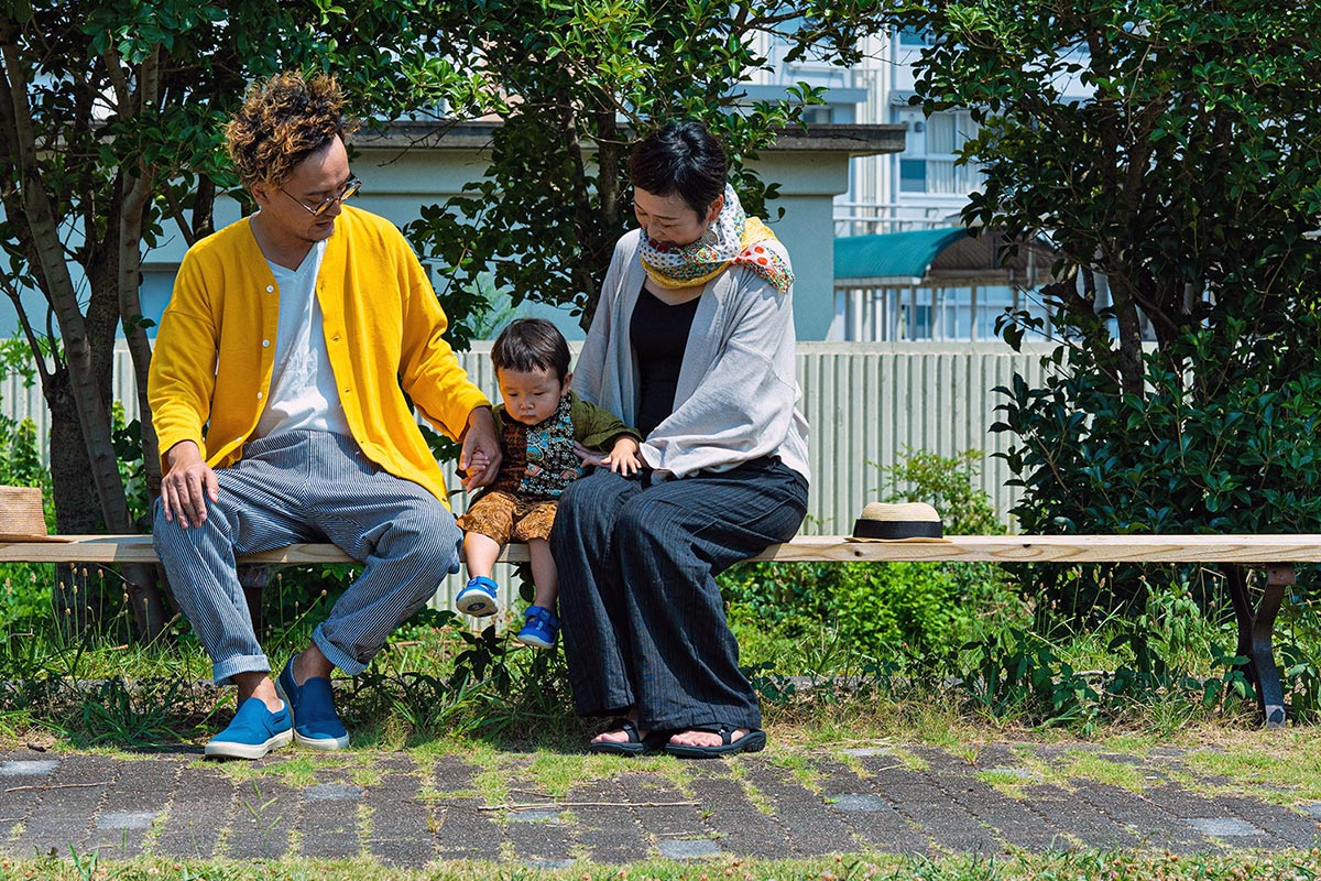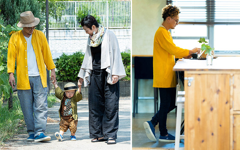 鯉口シャツ Unisexを着こなしたのは、コワーキングスペースオーナーの大介さん。仕事スタイルでは、スキニーのパンツを合わせてシャープな着こなしに。オフスタイルではゆるっとぱんつに履き替えて。あえて大きめのLong ver.を着用。