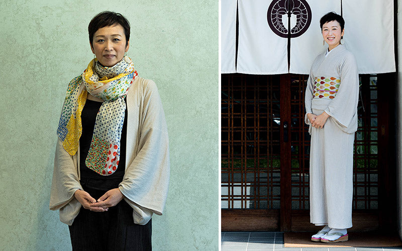 KIMONO WEAR Lady'sはnoi代表の真友梨が着用。本業の呉服屋では着物スタイル。オフではタイパンツとキャミソールに合わせて。